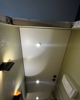 ВАННАЯ — парящий профиль FLEXY FLY 02 черного цвета + лента 12w 3000k, теневой диффузор с вентилятором D150, 3 накладных светильника DENKIRS, магнитная решетка.
